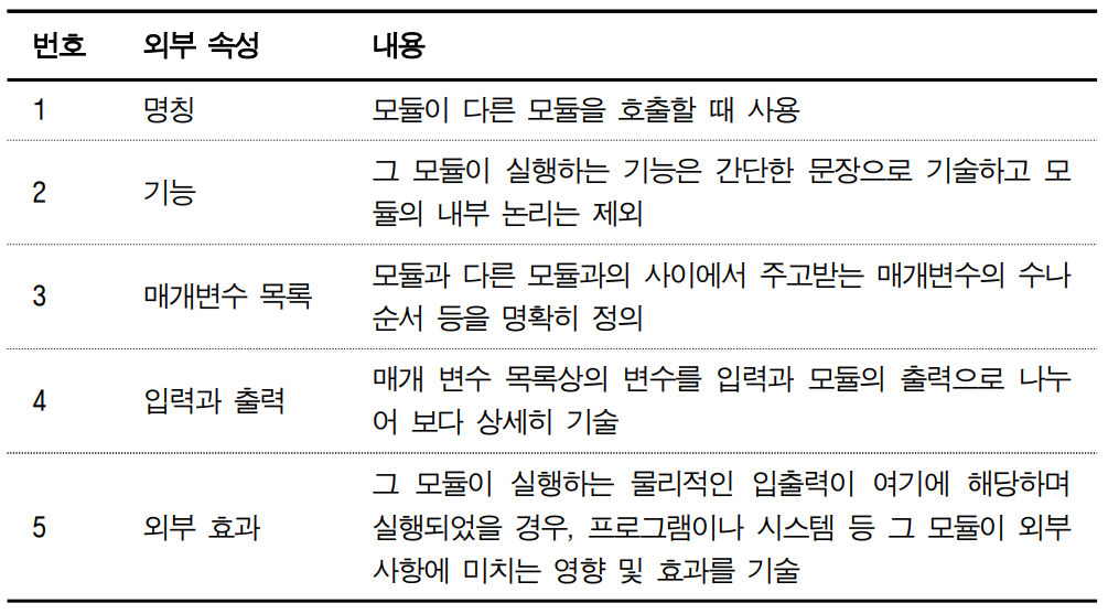 정보 숨김은 필요하지 않은 정보는 접근할 수 없도록 제외하여 하나의 하위 구조 또는 하 부 시스템의 자료, 절차에 대한 구체적인 구현 내용 및 내부 정보를 다른 외부 모듈의 접 근으로부터 통제한다. 즉, 정의된 메시지에 의해서만 접근과 전달이 되도록 하는 방법으로 각 하위 구조 구현에 서로 영향을 받지 않게 설계되는 것을 의미한다. 소프트웨어 아키텍 처 설계 단계에서 채택되는 설계 전략을 세부적으로 구분하여 설계 전략에 변경이 발생하 는 경우, 그 영향이 최소한의 모듈들에만 미치도록 하는 것으로, 모듈 단위의 변경 및 시 험이 쉬우며 유지보수 시 위험에 따른 영향이 최소화되는 큰 장점이 있다. 시스템 아키텍 처 설계에서 숨겨야 할 기본 정보는 상세한 데이터 구조, 하드웨어 디바이스를 제어하는 부분, 특정한 환경에 의존하는 부분(특정한 운영 체제나 DBMS에 의존하는 부분) 및 물리 적 코드(IP 주소, 문자 코드) 등이 있다.