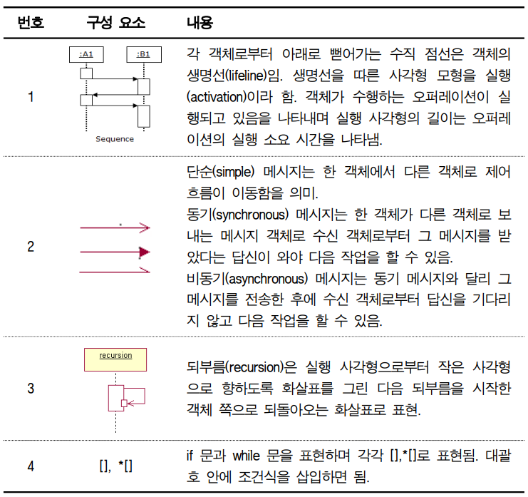 객체들의 행동을 시간의 관점에서 표현되며 객체에 실선 화살표로 그려지는 메시 지, 그리고 수직 진행 상황을 나타내는 시간으로 구성된다. sequence diagram은 아 주 단순하고 즉각적인 시각적 매력을 갖고 있기 때문에 자주 사용된다.