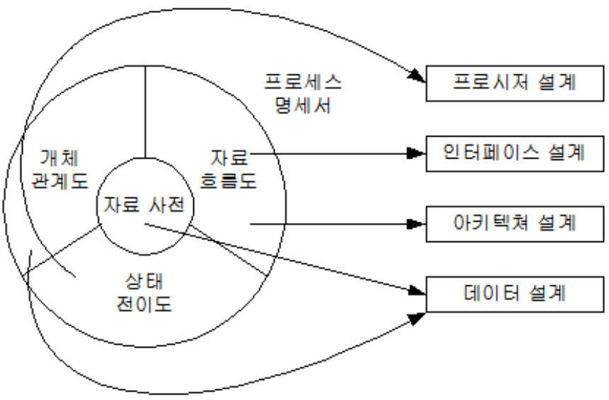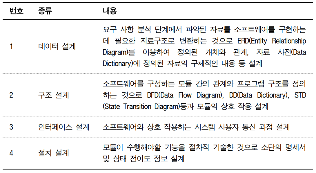 소프트웨어 설계 모형을 기술적인 관점에서 분류하면 데이터 설계(data design), 구조 설계 (architectural design), 인터페이스 설계(interface design), 절차 설계(processor design)로 구 성된다.
