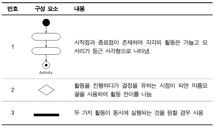 activity diagram은 오퍼레이션이나 처리 과정이 수행되는 동안 일어나는 일들을 간 단하게 표현하기 위해 고안되었다. activity diagram은 처리 단계, 결정 위치, 분기 처리를 표현할 수 있어 업무 과정이나 오퍼레이션에서 처리되는 일 등을 효과적으로 나타내는 데 사용된다.