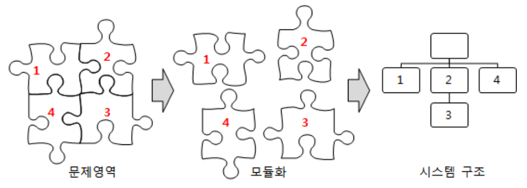 시스템 아키텍처 모듈화는 소프트웨어를 각 기능별로 분할하는 것을 의미하며 각 기능별 로 분할한 것을 의미한다. 세부 하위 모듈은 서브루틴, 부(sub) 시스템, 소프트웨어 내의 프로그램, 작업 단위 등을 의미한다. 모듈화를 이용하여 설계하면 소프트웨어의 복잡도가 감소하고 변경이 쉬우며 프로그램 구현이 용이하고 확장성, 융통성, 경제성 등이 향상된다