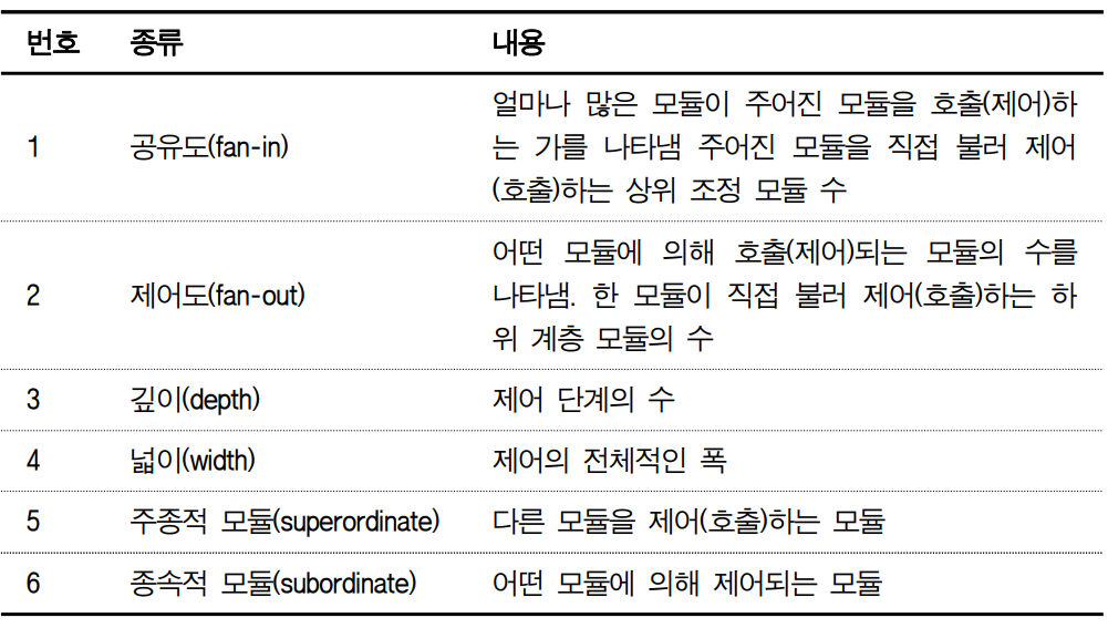 모듈 응집도는 정보 은닉 개념을 확장한 것으로 모듈 내부에서 처리 과정 및 정보의 생성, 소비가 이루어지는 정도를 의미한다. 모듈 내부 요소들 사이의 응집도가 증가하 도록 하는 것이 바람직하며 모듈의 응집도를 높이면 모듈 사이의 낮은 결합도를 얻을 수 있다. 독립적인 모듈이 되기 위해서는 각 모듈의 응집도가 강해야 하며 응집도의 종류에는 기능적 응집도, 순차적 응집도, 교환(통신)적 응집도, 절차적 응집도, 시간적 응집도, 논리적 응집도, 우연적 응집도가 있다.