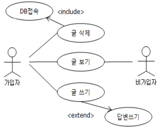 인터넷 사이트의 회원 게시판을 usecase diagram을 사용하면 다음과 같이 표현할 수 있다. 우선 비가입자는 글을 볼 수 있는 권한을 가지며 가입자는 읽고 쓰고 삭 제하는 권한을 가진다. 또 가입자는 글쓰기에 답변쓰기 기능도 확장할 수 있다.
