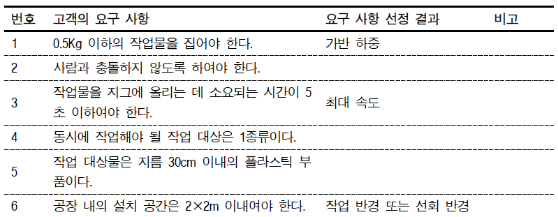 요구 사항에 대한 정리 표를 완성하고 나면, 요구 사항들 중에서 로봇 시스템의 사양에 포함되어야 하는 내용들을 분석하여 선별한다. pick and place 로봇에서 <표 1-5>의 요구 사항들 중 1번은 가반 하중에 관련된 요구이므로 요구 사항으로 선정되어야 하며, 3번은 속도에 관련된 요구이므로 요구 사항으로 선정되어야 한다. 이 외에도 6번은 로봇의 선회 반경과 바디의 길이의 최대값에 관한 정보이므로 요구 사항으로 고려되는 게 좋다. 이상과 같이 선별된 요구 사항을 정리하면 <표 1-7>과 같다.