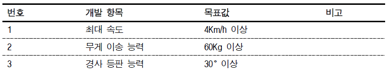 <표 1-7> 및 <표 1-8>과 같이 요구 사항이 선별되고 나면, 선별된 요구 사항들을 중심으로 로봇 시스템의 핵심 개발 목표를 설정하여야 하다. 위의 표를 이용하여 pick and place 의 로봇의 핵심 개발 목표를 설정하면 <표 1-9>와 같으며, 재난 구조용 모바일 로봇의 핵심 개발 목표를 설정하면 <표 1-10>과 같다.