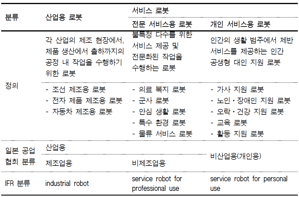 IFR은 <표 1-1>과 같이 로봇을 산업용 로봇과 비산업용 로봇으로 분류하고 있다.