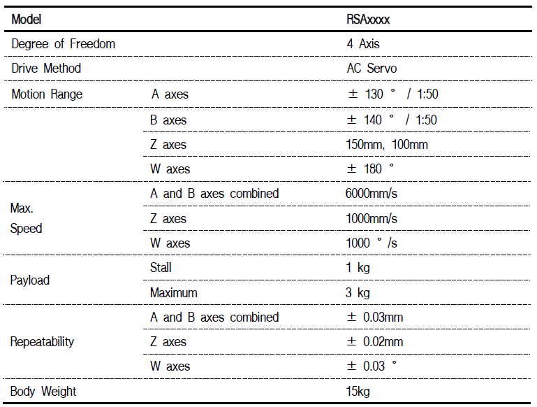 <표 1-3>은 00사의 스카라로봇(SCARA robot)에 대한 사양이다. 아래 표에서 중요한 기능적, 비기능적, 성능적 요구 사항은, 가반 하중(payload)은 정격 1kg, 최대 3kg, A, B축 합성 선회반경(motion range)은 ±130°, A, B축 합성 반복정밀도(repeatability)는 ±0.03mm 등이다.