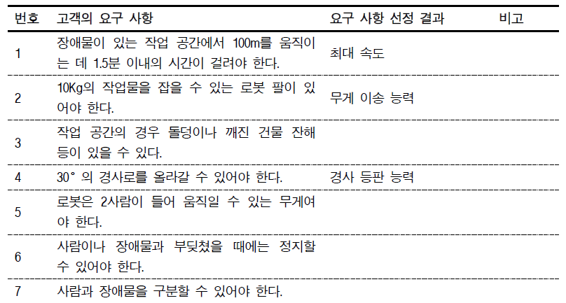 재난 구조용 모바일 로봇에서 <표 1-6>의 요구 사항들 중 2번은 무게 이송 능력에 관련된 요구이므로 요구 사항으로 선정되어야 하며, 4번은 경사 등판 능력에 관련된 요구이므로 요구 사항으로 선정되어야 한다. 반면 3번의 경우 재난 구조 로봇이 일반적으로 가져야 하는 로봇 기구부의 구조(캐터필더식 또는 험지 이동형 모바일 로봇 타입)이므로 필수 요구 사항으로 선정하지 않아도 된다. 다만 로봇이 실내 물류 이송용 모바일 로봇인지, 아니면 재난 구조용 모바일 로봇인지에 따라 로봇 기구부의 구조가 달라져야 하기 때문에 로봇 기구부 설계 단계에서는 고려되어야 할 사항이다. 이상과 같이 선별된 요구 사항을