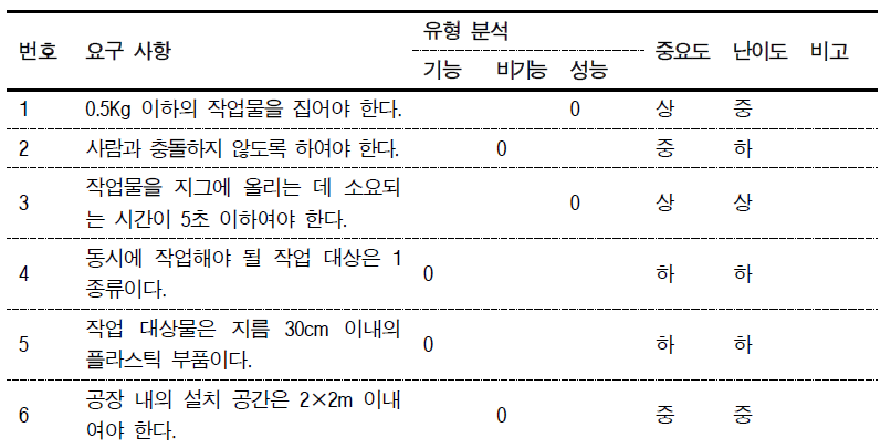 요구 사항에 대한 정리 표를 완성하고 나면, 요구 사항들 중에서 로봇 시스템의 사양에 포함되어야 하는 내용들을 분석하여 선별한다. pick and place 로봇에서 <표 1-5>의 요구 사항들 중 1번은 가반 하중에 관련된 요구이므로 요구 사항으로 선정되어야 하며, 3번은 속도에 관련된 요구이므로 요구 사항으로 선정되어야 한다. 이 외에도 6번은 로봇의 선회 반경과 바디의 길이의 최대값에 관한 정보이므로 요구 사항으로 고려되는 게 좋다. 이상과 같이 선별된 요구 사항을 정리하면 <표 1-7>과 같다.
