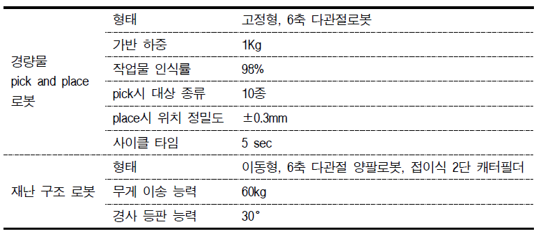 산업용으로 많이 사용되는 pick and place 로봇의 경우 가반 하중이나 작업물 인식률, 파지(pick)시 대상 종류 등이 중요한 요구 사항이 될 것이며, 재난 구조 로봇의 경우 무게 이송 능력, 경사 등판 능력 등이 중요한 요구 사항이 될 것이다.