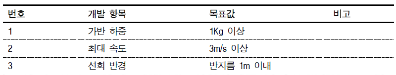 <표 1-7> 및 <표 1-8>과 같이 요구 사항이 선별되고 나면, 선별된 요구 사항들을 중심으로 로봇 시스템의 핵심 개발 목표를 설정하여야 하다. 위의 표를 이용하여 pick and place 의 로봇의 핵심 개발 목표를 설정하면 <표 1-9>와 같으며, 재난 구조용 모바일 로봇의 핵심 개발 목표를 설정하면 <표 1-10>과 같다.