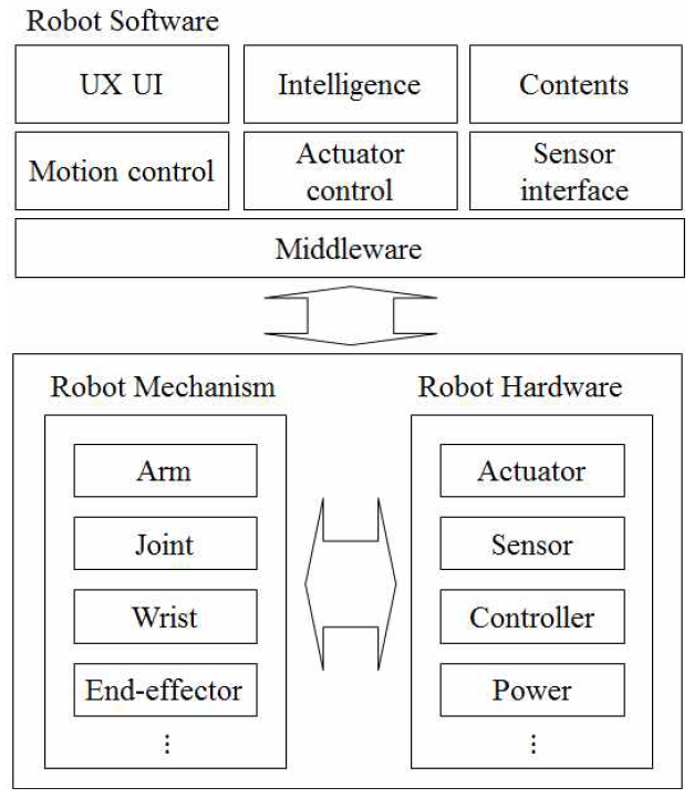 로봇 기구부는 팔(arm)과 조인트(joint)로 구성되는 로봇 기구, 엔드이펙트(end-effector), 로봇 기구 주변 장치 등으로 구성되어 있으며, 로봇 하드웨어는 액츄에이터, 센서, 모션 제어기, 전원부, 마이크로컨트롤러 등으로 구성되어 있다. 로봇 소프트웨어는 로봇의 분류에 따라 매우 다양한 구성으로 이루어질 수 있는데, 미들웨어, 액츄에이터 제어 소프트웨어, 센서 인터페이스, 모션 제어 소프트웨어, UX UI, 지능 소프트웨어, 콘텐츠 소프트웨어등으로 구성되어 있다.
