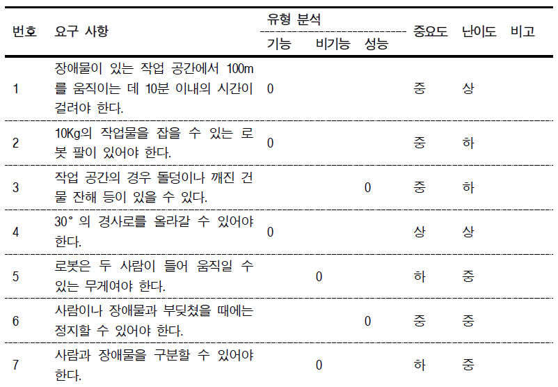 • 로봇 수요자의 요구 분석에 활용할 요구 대상 및 요구 분석 영역과 항목을 결정할 수 있다.