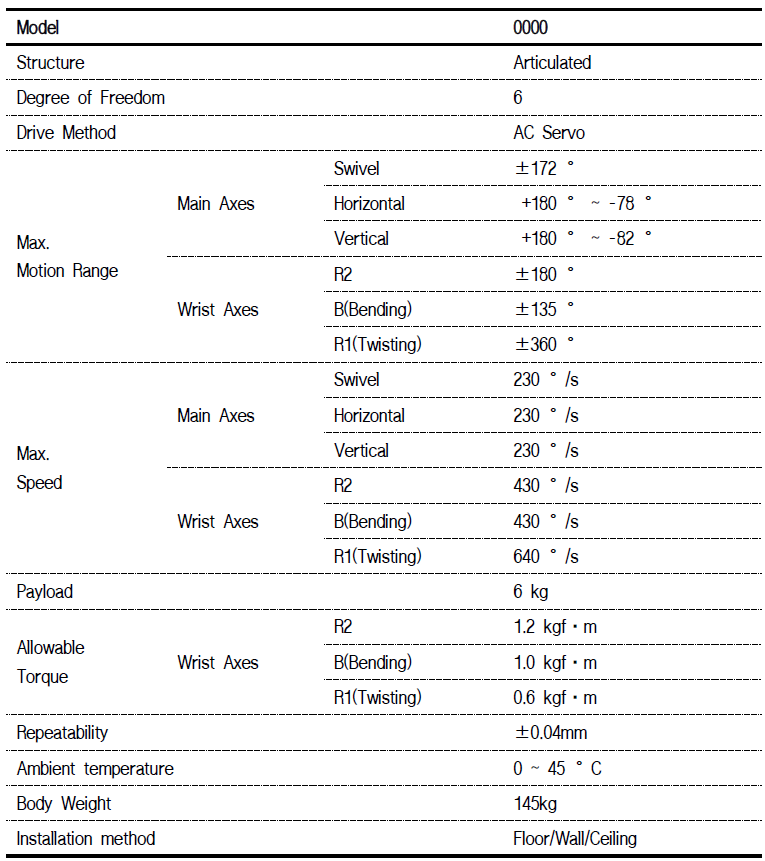 <표 1-2>는 인터넷을 통하여 확인한 00사의 다관절로봇에 대한 사양이다. 아래 표에서 중요한 기능적, 비기능적, 성능적 요구 사항은, 자유도(degree of reedom)는 6자유도, 가반하중(payload)은 6kg, 주축의 선회 반경(max. motion range, swivel)은 ±172°, 반복정밀도 (repeatability)는 ±0.04mm 등이다.