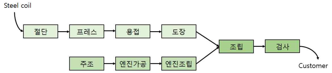 먼저 적용할 공정과 작업의 특성에 대해 분석한다. 공정 분석이란 [그림 1-2]와 같이 대상물이 어떤 경로로 처리되었는지를 발생 순서에 따라 분류하고, 각 공정 조건(가공 조건, 경과 시간, 이동 거리 등)과 함께 분석하는 것이다. 작업 분석이란 [그림 1-3]과 같이 공정을 구성하고 있는 개개의 작업에 대한 작업 방법을 분석하는 것이다. [그림 1-2]는 자동차 공장의 공정을 간략하게 나타내고 있는데, 차체를 제작하기 위하여 강철을 절단, 프레스, 용접, 도장을 하는 공정 흐름을 보여주고 있다.