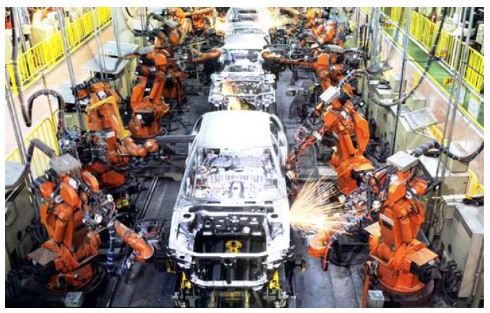 [그림 1-4]는 자동차 공장에서 아크 용접의 예를 보여준다. 아크 용접은 주로 자동차, 조선이나 일반 기계의 부품을 제작하는 곳에서 두꺼운 금속성의 판재에 토오치(torch)를 통해 아크를 발생시켜 용접하여 접합시키는 방법이다.