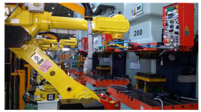 [그림 1-6]은 프레스 공정에서 로봇의 적용 예를 보여준다. 프레스 공정은 수십에서 수천톤의 프레스를 이용하여 다양한 소재의 제품을 열간 또는 냉간 소성 가공하는 작업이다. 프레스 공정의 경우 부품의 크기는 수십 g에서 수십 kg으로 그렇게 무겁지는 않지만, 매우 빠른 속도로 작업이 이루어지기 때문에 손가락 절단과 같은 산재가 많이 발생되는 환경이다. 따라서 그림과 같이 프레스 기계 앞에 2대의 다관절 로봇을 배치하여 프레스 작업을 수행한 후 한 대의 로봇은 완제품을 꺼내고 다른 로봇은 재공품을 넣는 역할을 하게되면 이러한 문제를 해결할 수가 있다.