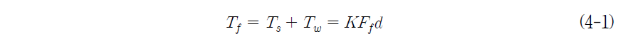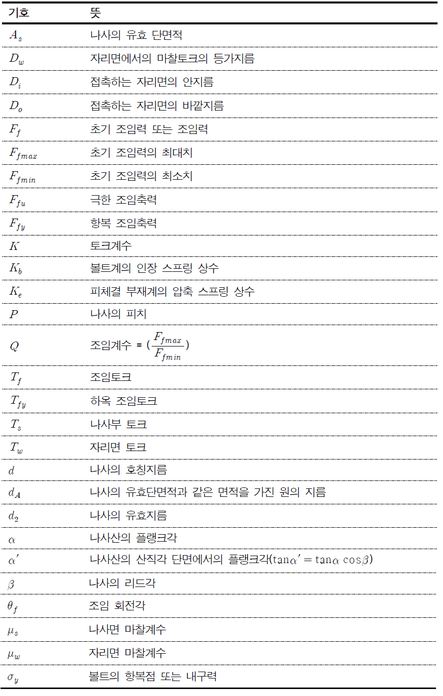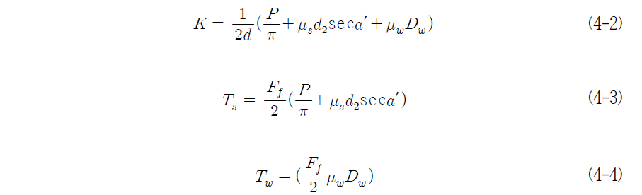 기본적으로 조임을 이해하기 위해서는 토크와 조임력 간의 관계를 이해하여야 하며 토크와 조임력의 관계는 식 (4-1)과 같다. 또 사용된 기호와 뜻은 <표 4-1>과 같다.