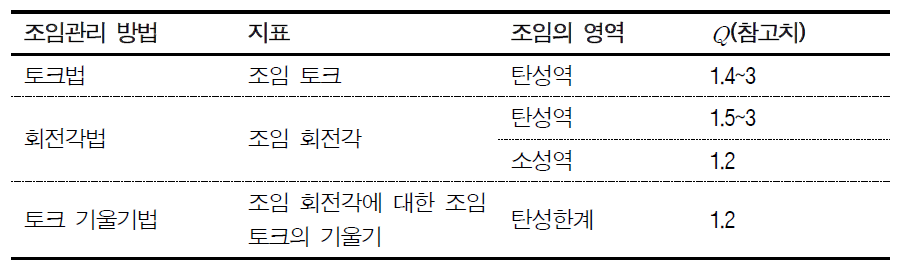 규격에서 규정하는 조임 관리 방법은 토크법, 회전각법, 토크 기울기법이 있으며 이를 정리한 것은 <표 4-2>와 같다.