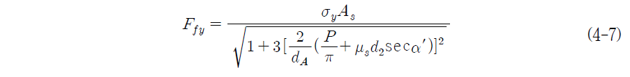 재료의 항복이 전단변형 에너지설에 따른다면, 볼트의 나사부가 가장 약한 단면인 호칭 지름 볼트 및 유효지름 볼트의 항복 조임 출력 F_fy 는 식(4-7)에 따라 구한 값이 된다.