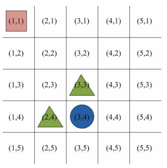 [그림 2-11]의 그리드 월드에서는 사각형으로 표현된 에이전트가 원이 있는 상태로 가는 행동을 했을 때는 의 보상을, 삼각형이 있는 상태로 가는 행동을 했을 때는 의 보상을 받음