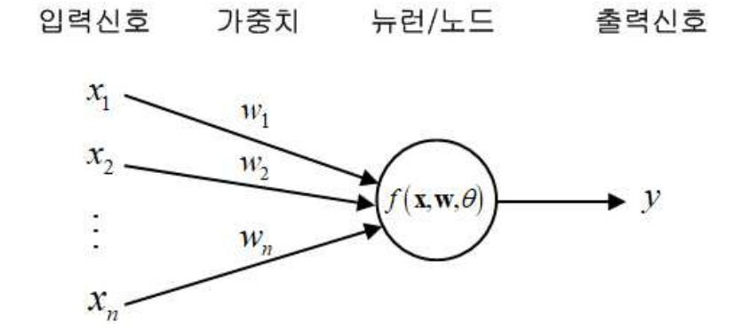 뉴런/노드는 입력 신호의 가중치 합을 계산하여 임계값 이상이 되면 계단 함수나 시그 모이드(sigmoid) 함수 같은 활성화 함수(activation function)를 출력신호로 보낸다. 시그모 이드 함수를 활성화 함수로 쓴 경우를 식으로 표현하면 다음과 같다.