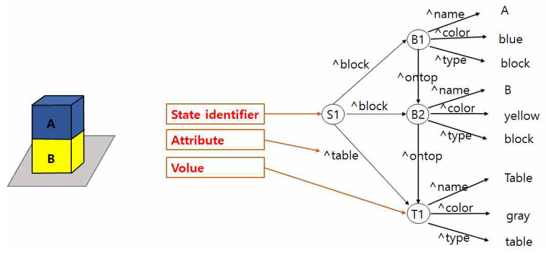 작업 메모리 요소의 객체(object)는 동일한 식별자를 공유하는 작업 메모리 요소들의 집합을 의미하며, 블록, 벽, 음식조각, 보드 위에 있는 셀 등의 실세계와 관련된 것들을 표현한다. [그림 2-2]는 작업메모리의 예로서 “테이블 위에 두 개의 블록이 있는 데, 하나는 다른 하나 위에 있고, 하나는 테이블 위에 있다.”는 상황을 표현한다.