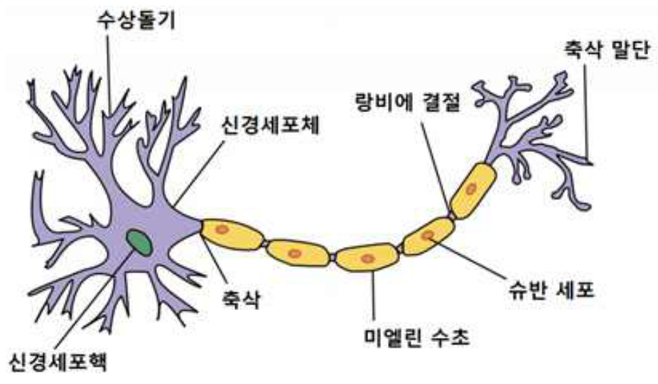 심층신경망(deep neural network, DNN)은 인공신경망(artificial neural network)을 확장한 것이다. 인공신경망은 인간의 뇌를 기반으로 한 추론모델이며, 인간의 뇌는 약 1,000억개의 신경세포(neuron)와 각 뉴런을 연결하는 6조개의 시냅스(synapse)로 구성되어 있다. 각각의 뉴런은 [그림 2-4]처럼 신경세포체(soma), 수상돌기(dendrite), 축색돌기(axon), 축색종 말(axon terminal)로 구성되어 있다.