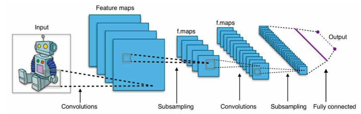 • 사람의 시각인지 과정을 모방한 컨벌루션(convolution) 기법을 이용한 필터 커널(kennel) 사용 • 컨벌루션이 완료되면 각 픽셀에 있는 데이터를 활성화 함수에 적용해 판별력 강화. 활성화 함수로 ReLU(rectified linear unit) 함수가 많이 사용됨 • 처리할 데이터를 줄이기 위해 이웃한 데이터 간 대비율(contrast)을 높이고 데이터 수를 줄이는 풀링(pooling) 또는 서브샘플링(sub-sampling) 시행. 풀링에는 최대 풀링(max pooling), 평균 풀링(average pooling), 확률적 풀링(stochastic pooling)이 있음 • 상기 필터링 - 활성화 - 풀링 과정을 반복적으로 거치면서 좀 더 확대된 형체의 이미지 구성 • 마지막 풀링이 끝나면 데이터가 1차원 벡터 형태로 정렬되고 이 값들은 전체 연결 신경 망(fully-connected network)의 입력층으로 보내짐. 이후에는 몇 개의 추가적인 다층 신경망을 통해 피드포워드 및 역전파 과정을 거치며 학습이 진행됨