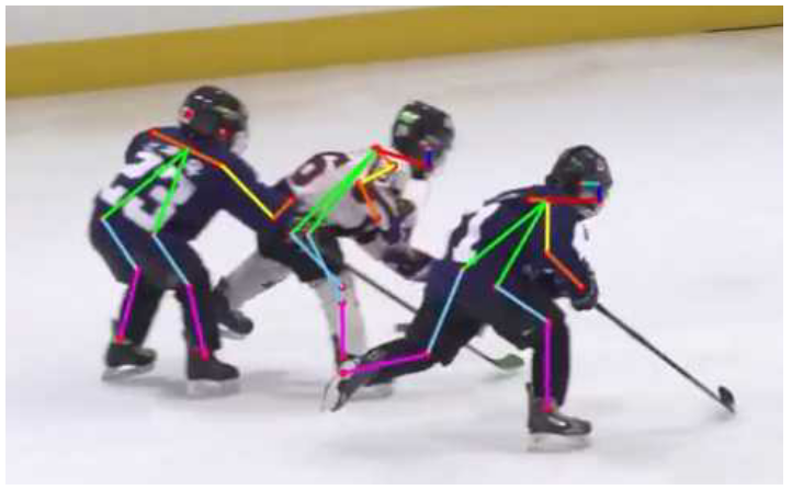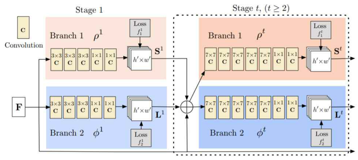 [그림 2-9]는 카네기멜론 대학교에서 openCV와 CNN을 기반으로 개발한 OpenPose가 동영 상으로부터 실시간 자세 추정을 하는 장면을 보이고, [그림 2-10]은 OpenPose의 CNN구조를 보인다.