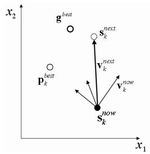 는 현재 번째 개체의 방향벡터와 위치벡터를 각각 나타내며, 위치벡터에 방향벡터를 더함으로써 다음 차수의 위치벡터를 결정한다. 식에서 는 방향 벡터의 관성 가중치(inertial weight)를, 과 는 학습요인(learning factor)의 가중치 계수를 나타내며, 과 는 주변점을 랜덤하게 탐색하기 위해 0과 1 사이에서 발생시킨 균일분포난수(uniformly distributed random number)를 의미한다. [그림 2-12]는 2차원 탐색 공간에서 PSO의 번째 개체에서 식 (9)와 식 (10)을 이용하여 다음 위치벡터를 결정하는 원리를 벡터도로 표현한 것이다.