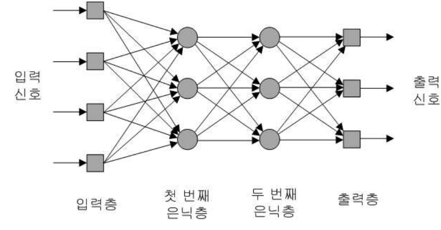 1962년 로젠블래트는 센서(sensor) 유닛, 연계(association) 유닛, 반응(response) 유닛의 3개 유닛으로 확장 구성된 퍼셉트론 이론을 발표했는데, 이를 다층 퍼셉트론(Multi-Layer Perceptron)이라고 한다. 이는 입력층(input layer), 은닉층(hidden layer), 출력층(output layer)으로 구성된 피드포워드 신경망(feedforward neural network)이라고도 불리며, DNN의 기본구조를 이룬다. [그림 2-6]은 2개의 은닉층이 있는 다층 피드포워드 신경망을 보인다.