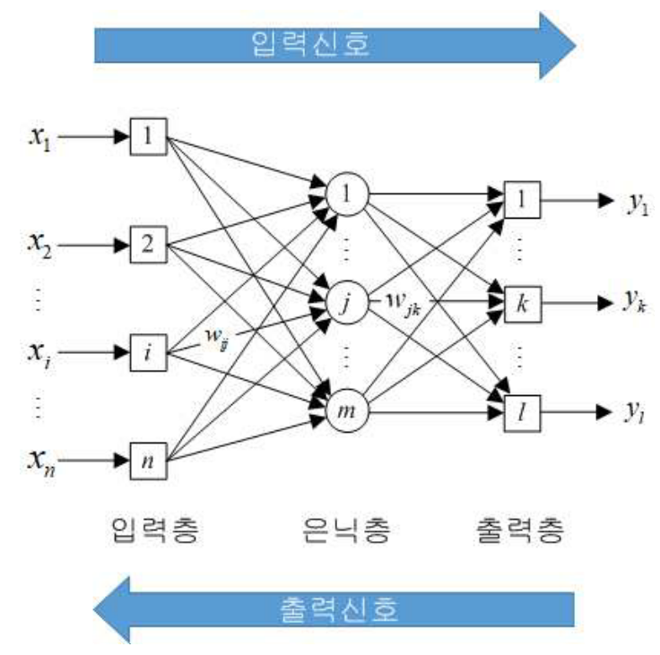 역전파(back propagation)는 라벨이 붙은 학습 데이터를 가지고 여러 개의 은닉층을 가지는 피드포워드 신경망을 학습시키는 데 사용되는 대표적 지도학습(supervised learning) 알고리즘이다. 역전파는 [그림 2-7]에서 볼 수 있듯이 두 단계로 구성되는데, 첫 번째 단계 에서는 학습 데이터를 신경망의 입력층에 전달하고 각 은닉층의 노드와 링크들을 거치며 계산된 값을 출력층 노드에서 출력한다. 두 번째 단계에서는 출력층의 출력 값과 라벨 값과의 오차를 최소화하도록 출력층부터 역방향으로 오차제곱합(sum squared error)의 경사 도(gradient) 정보를 이용하여 가중치를 조정한다.