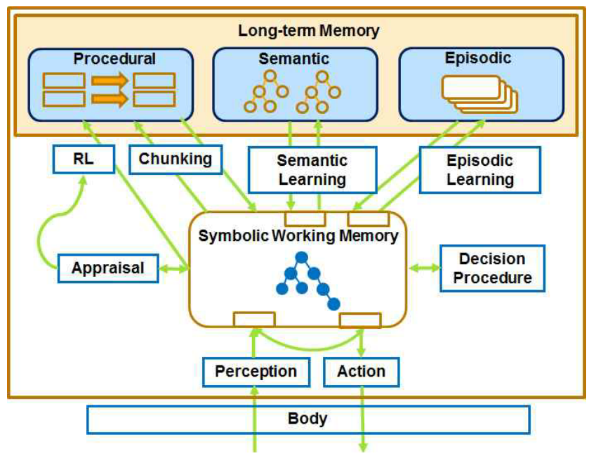 ·의미적(semantic) 메모리 • 복수개의 단기지식(short-term knowledge): 작업 메모리 요소(working memory element), 상징적(symbolic)・도식적 (diagrammatic)・형상기반(imagery-based) 표현 • 복수개의 학습 메커니즘: 강화학습(reinforcement learning), 청킹(chunking), 삽화적· 의미적 학습