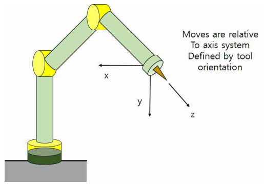 이 두 가지 방법은 월드좌표계와 공구좌표계이다. 두 좌표계는 모두 직교좌표계를 사용한다. [그림 3]과 같은 월드좌표계에서는 기준 원점과 좌표축은 어떤 고정된 위치와 로봇 베이스에 대한 상대적인 위치로 정의된다. [그림 4]에서 보여준 공구좌표계 에서 좌표계는 손목 면판(faceplate, 엔드이펙터가 붙는 곳)의 자세에 대해 상대적으로 정의된다.