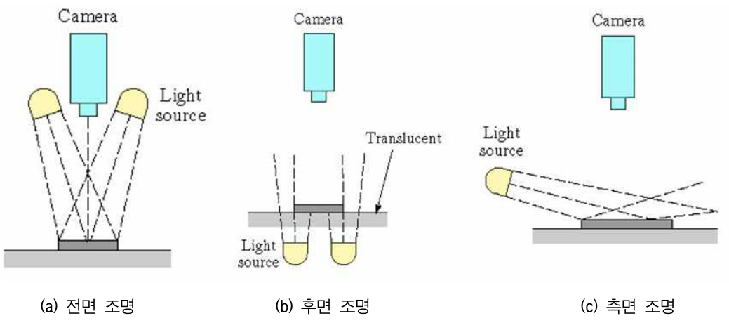 [그림 3]은 조명의 종류를 나타내고 있다. 조명에는 전면조명, 후면조명, 측면조명 등이 있다.