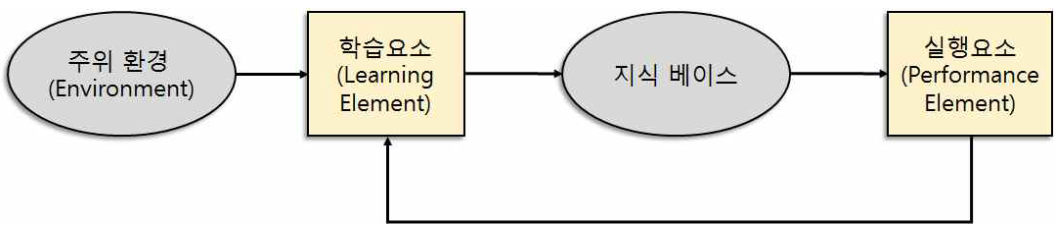 [그림 1]은 단순 기계 학습 시스템의 모델을 나타낸다. 그림에서 원으로 표시된 부분은 정보의 선언적인 부분(즉, 사실 표현)을 나타내며 사각형은 절차들을 나타낸다. 화살표는 학습 시스템 내에서의 자료 흐름의 방향을 나타낸다. 주위 환경은 학습 요소(learning element)에 특정 정보를 제공하고, 학습 요소는 이 정보를 이용하여 지식베이스를 개선한 다. 실행 요소는 지식베이스를 이용하여 특정 작업을 수행하고, 작업을 수행하는 동안에 얻은 정보는 다시 학습 요소에 반영시킨다. 이 모델은 가장 기본적인 것으로서 많은 중요한 기능들이 생략되어 있지만, 이들 네 가지 구성 요소들을 어떻게 구현하는가에 따라서 학습 시스템을 분류하는 데 많은 도움을 줄 수 있다. 특정의 응용 시스템이 있다면, 주위 환경, 지식베이스, 실행 작업들이 주어진 학습 문제의 본질을 결정지을 수 있으며, 이를 통해서 학습 요소가 수행해야 하는 특정 기능들을 결정할 수 있다.