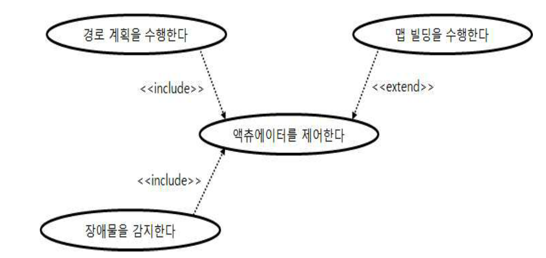 하나의 사용 사례는 특별한 조건 하에 다른 사용 사례로 확장될 수 있다. 포함 관계에 있는 2개의 사용 사례는 반드시 같이 수행되는 반면, 확장된 사용 사례는 예외적으로 이벤트가 추가될 때에만 수행된다. [그림 6]에서 보듯이 사용 사례 다이어그램에서는 방향이 반대인 점선 화살표로 표시하고 <<extend>>라는 표시를 한다. 이때 조건을 같이 명시하면 읽기 좋은 사용 사례 다이어그램이 된다. 장애물이 감지되어 액추에이터 제어를 할 경우에는 경로 계획을 수행하여 최적의 경로를 생성하게 된다. 만약, 감지된 장애물이 맵을 재생 성해야 할 만큼 중요한 장애물이라면 맵 빌딩을 수행하여야 한다. 아래 그림에서맵 빌딩은 조건이 성립되었을 때 수행하면 된다는 의미이다.