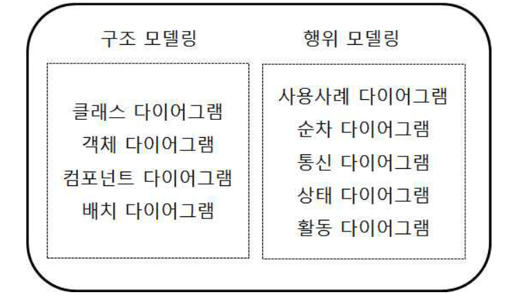 UML 다이어그램에는 [그림 7]과 같이 시스템의 정적인 부분(구조 모델링)을 가시화하기 위하여 클래스 다이어그램, 객체 다이어그램, 컴포넌트 다이어그램, 배치 다이어그램 등을 사용하며, 시스템의 동적인 부분(행위 모델링)을 가시화하기 위하여 사용 사례 다이어그 램, 순차 다이어그램, 통신 다이어그램, 상태 다이어그램, 활동 다이어그램 등을 사용한다.