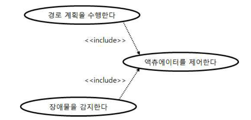 여러 개의 사용 사례에서 공통적으로 사용되는 사용 사례를 떼어 냄으로써 사용 사례 다이어그램의 복잡도를 줄일 수 있다. 이때 여러 개의 사용 사례와 떼어 낸사용 사례는 서로 포함관계에 있다고 말한다. [그림 5]에서 보듯이 사용 사례 다이어그램에서는 점선 화살표로 표시하고 <<include>>라는 표시를 한다. 포함된 사용 사례는 포함하는 사용 사례가 수행될 때 반드시 같이 수행되어야 한다. 그림의 사용 사례의 의미는 사용자가 정지 버튼을 누르거나, 로봇이 초음파 센서를 이용하여 장애물을 감지하였을 때는 액추에이터를 제어한다는 의미이다. 액추 에이터를 제어한다는 사용 사례에는 여러 가지 경우의 수에 따라 정지하는 기능, 왼쪽 또는 오른쪽으로 방향을 전환하는 기능, 후진을 하는 기능 등이 포함될 수 있다.